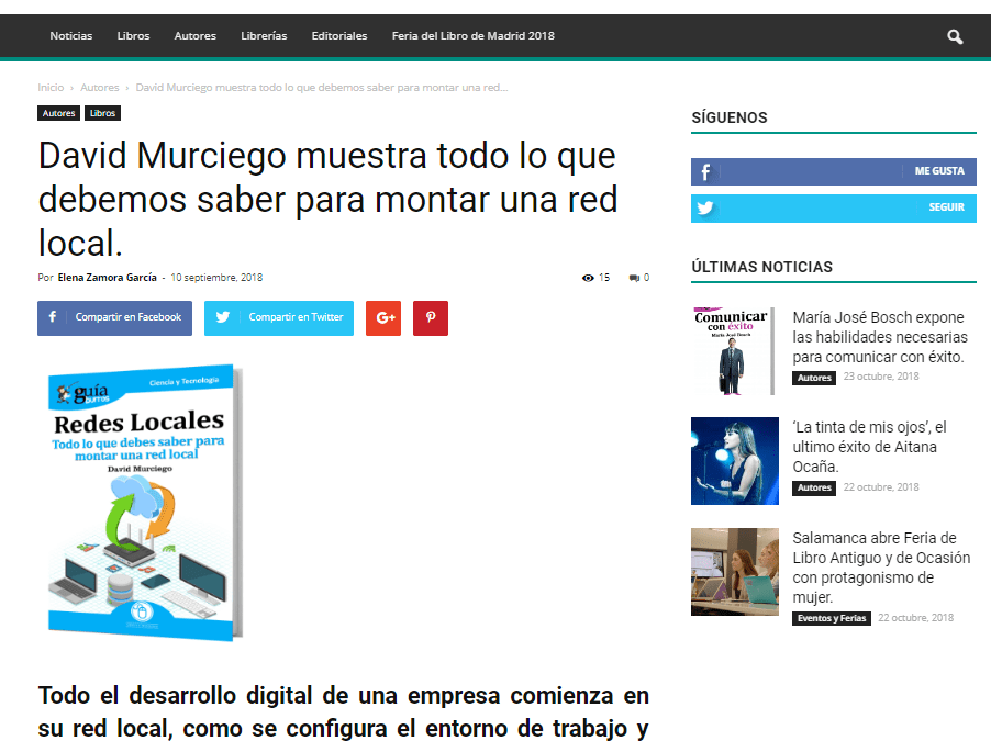Casa de Letras, medio especializado en literatura y manuales de lectura, habla sobre el último trabajo de David Murciego. Para ver el artículo completo, pincha en el enlace: Casa de Letras «GuíaBurros: Redes Locales»